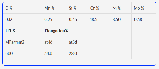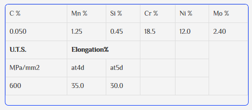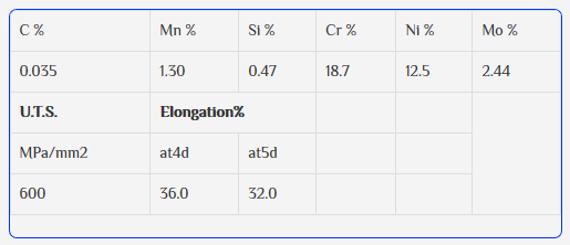 316L.COM is a Low carbon Stainless steel electrode depositing weld metal of 18 Cr-11 Ni 2.5 Mo chemical composition. The deposited metal displays excellent mechanical properties including high creep stregth. The addition of Molybdenum in the electrode increases the resistance of weld metal to pitting corrosion upto 850°C. Electrode can be operated either on DC (+) or AC, Beed is smooth and finely rippled.Slag detachability is easy. Beeds are of Radiographic quality. 316L.COM is ideal for joining or resurfacing of wrought and cast materials conforming to AISI 316/ 31 6L grade of materials and the materials of similar compositions.