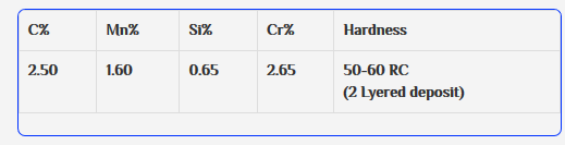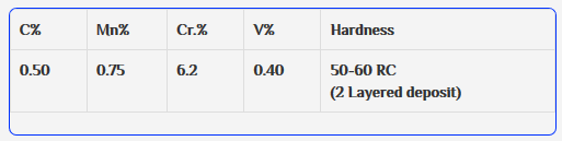HARDFACE -60 RC produces a very hard & sound weld deposit which has excellent resistance to abrasion combined with moderate impact. Two layered hardness on mild steel is between 50-60 RC ( 500-600 BHN) & hence machining is not possible. Jobs can only be grinded. Weld beed is free from porosity & running characteristics are pleasing. Arc is very stable and deslagging is easy. Hardface 60 RC is Suitable to lay hardface layers on worn out parts for enhancing its service life. Some typical applications can be termed as excavator teeth, muller ploughs, oil expeller worms, plough shares, crushing hammers, crane wheels, scraper blades etc.
