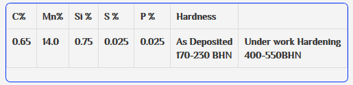 HARDFACE - Mn is a basic coated AC/DC electrode depositing an austenitic manganese steel weld metal. The Deposits of Hardface - Mn have excellent resistance of wear due to abrasion & high impact. Because of high Manganese recovery in weld beed. It is ideally suited for resurfacing of wornout austenitic manganese steel parts containihg 12-14% Manganese. When Hardface -Mn is to be used on plain carbon steel or low alloy steels, a buffer layer of stainless steel electrodes (such as Chronicord18-8-5 ) should be applied & then Hardface - Mn should be used for subsquent layers. Prime uses are in Crusher Jaws, Dragline Bucket teeth, Ball mills, Railway Crossings, Cement Grinder rings, Muller tyres etc.